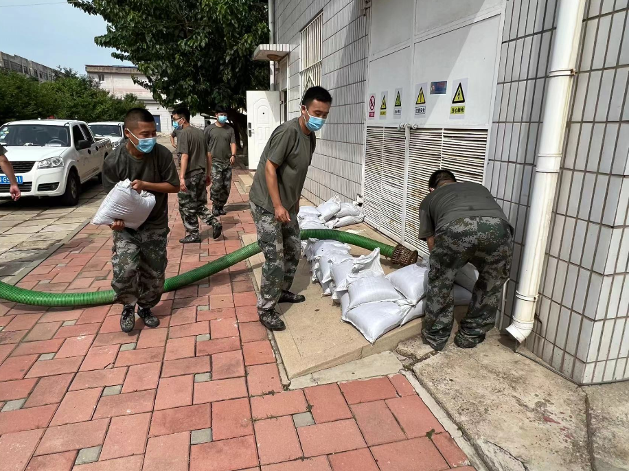 上圖為防汛搶險隊用沙袋搭建圍堰并鋪設(shè)排水管道